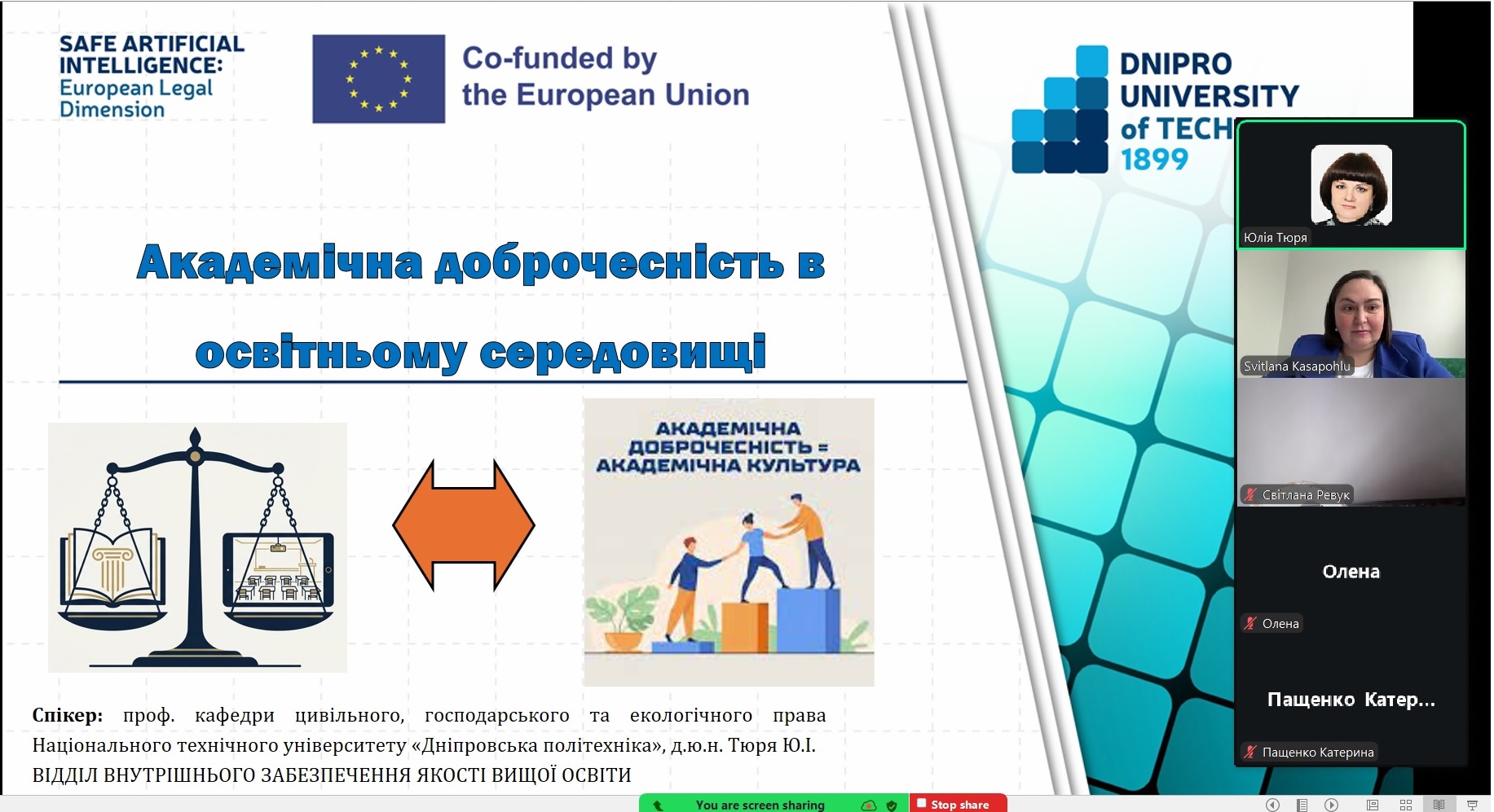 18 березня 2026 року в межах реалізації міжнародного проєкту, співфінансованого ЄС, «Безпечний штучний інтелект: європейський правовий вимір» (Safe Artificial Intelligence: European Legal Dimension) відбувся актуальний вебінар-тренінг «Академічна доброчесність в освітньому середовищі». Захід провела координаторка проєкту, д.ю.н., професорка кафедри цивільного, господарського та екологічного права Національного технічного університету «Дніпровська політехніка» Юлія Тюря.