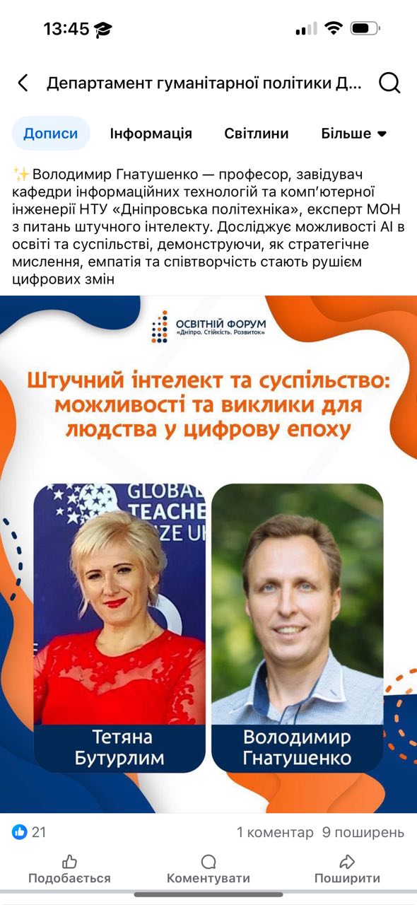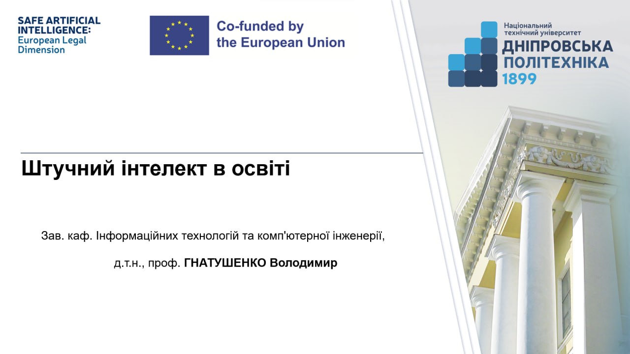 У межах тематичного блоку «Штучний інтелект та суспільство: можливості та виклики для людства у цифрову епоху» з доповіддю «Штучний інтелект в освіті» виступив професор Гнатушенко В.В., відповідальний виконавець проєкту «Безпечний штучний інтелект: європейський правовий вимір».